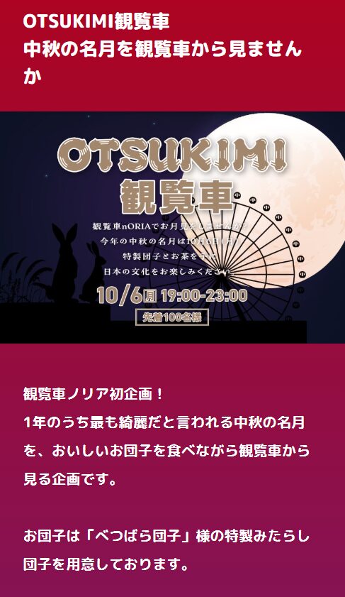 Also, regarding the Ferris wheel, there will be an event called “Moon Viewing Ferris Wheel” on October 6th from 7:00 PM to 11:00 PM, where you can enjoy moon viewing from inside the Ferris wheel [Note 3]. This event is limited to the first 100 people, so please apply early if you wish to attend. You’ll be able to view the harvest moon from the Ferris wheel. Why not enjoy this event and experience Japanese culture while savoring some specially made dumplings and tea?