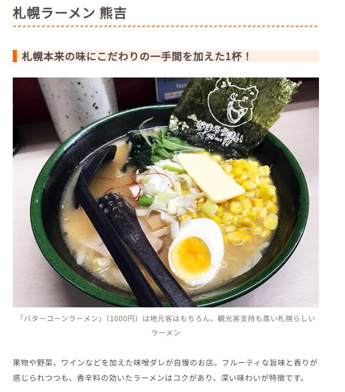 On the other hand, in contrast to these unique establishments, there are also establishments serving traditional miso ramen and corn ramen that are truly Sapporo-esque. Aji no Karyu offers corn butter ramen with a light yet satisfying flavor. Sapporo Ramen Kumakichi also offers butter corn ramen and is especially recommended for miso ramen lovers. Mensho Shirakaba Sanso is a ramen shop often mentioned when talking about miso ramen in Sapporo.