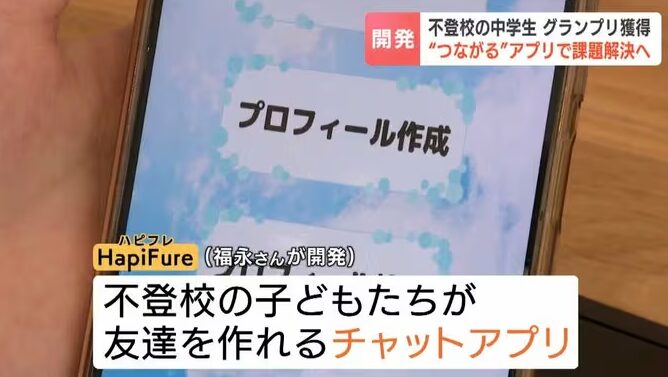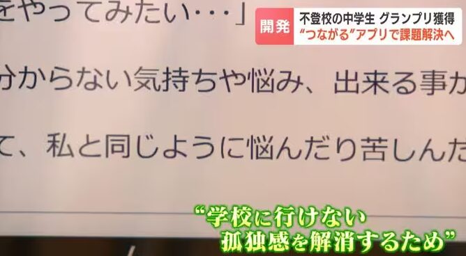 A 14-year-old school refusal student, Sara Fukunaga, created an app that won the grand prize in a contest for teenagers to develop apps to solve everyday problems. [Note 1] Fukunaga says she stopped going to school in the first grade due to troubles with her teachers. She developed the app to connect with peers in the same situation and overcome the loneliness of not being able to go to school.