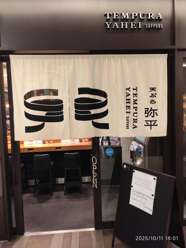 These establishments are located on the south side of the Sapporo Underground Pedestrian Space, while a McDonald’s and a bar are located on the north side. Also on the north side, there’s a building called Miredo, directly connected to the Sapporo Underground Pedestrian Space, lined with numerous restaurants. [Note 3] With a wide variety of cuisines, there’s sure to be at least one restaurant that suits everyone’s tastes. Incidentally, the restaurant I visited was a tempura restaurant called Yahei. [Note 4] It’s located on the first floor of the building. It serves delicious tempura and offers takeout, so your family and friends might be delighted if you buy some of Yahei’s delicious tempura as a souvenir.