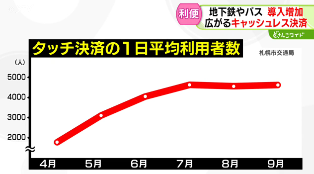 In addition, all Sapporo Municipal Subway stations have implemented cashless credit card payments, aiming to increase convenience for tourists and others by eliminating the need to purchase tickets or charge IC cards. The average daily user count in April was 1,768, but by September it had risen to 4,604, nearly tripling.