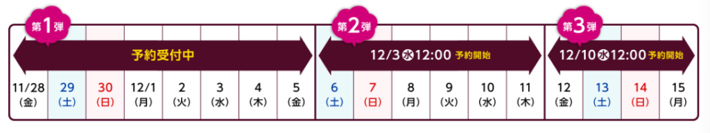 Please note, however, that reservations are required. Specifically, as shown in the chart below [Note 2], reservations are currently being accepted from November 28th to December 5th. For December 6th to December 11th, reservations will open at 12:00 PM on December 3rd. For December 12th to December 15th, reservations will open at 12:00 PM on December 10th.
